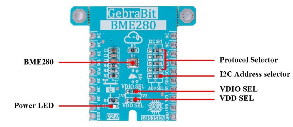 GebraBit BME280 یک ماژول دیجیتال اندازهگیری رطوبت نسبی، فشار بارومتریک و دمای محیط است. ماژول GebraBit BME280 را میتوان با انتخاب یکی از دو ولتاژ تغذیهی 1V8 یا 3V3 از طریق جامپر سلکتور VDD SEL راهاندازی کرد،همچنین یک جامپر دیگر نیز به نام VDIO SEL در این ماژول تعبیه شده که این جامپر به منظور انتخاب سطح منطقی ولتاژ پایههای ورودی/خروجی ماژول بین “1V8” یا “3V3” در نظر گرفته شدهاست. این ویژگی این امکان را فراهم میآورد تا کاربران بتوانند از طیف وسیعی از میکروکنترلرها برای ارتباط با ماژول استفاده کنند.