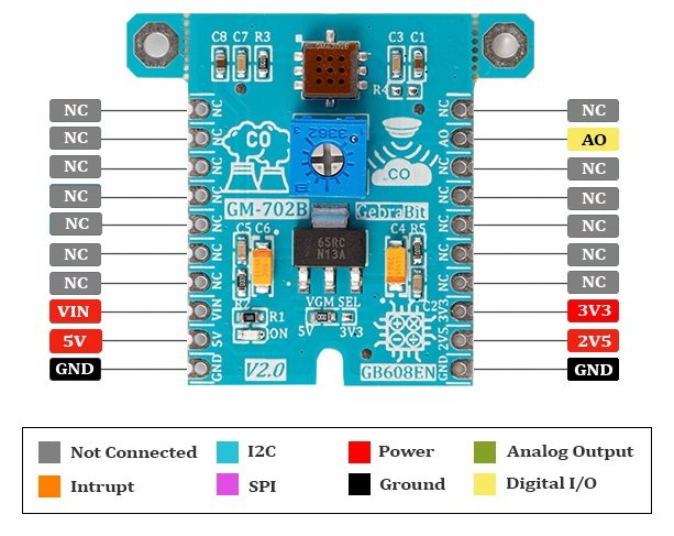 GebraBit GM-702B یک ماژول حسگر گاز CO مونوکسید کربن MEMS است. ماژول GebraBit GM-702B، به دلیل یک رگولاتور یکپارچه 2V5، برای روشن کردن هیتر GM-702B به ولتاژ منبع تغذیه تا 9 ولت نیاز دارد..