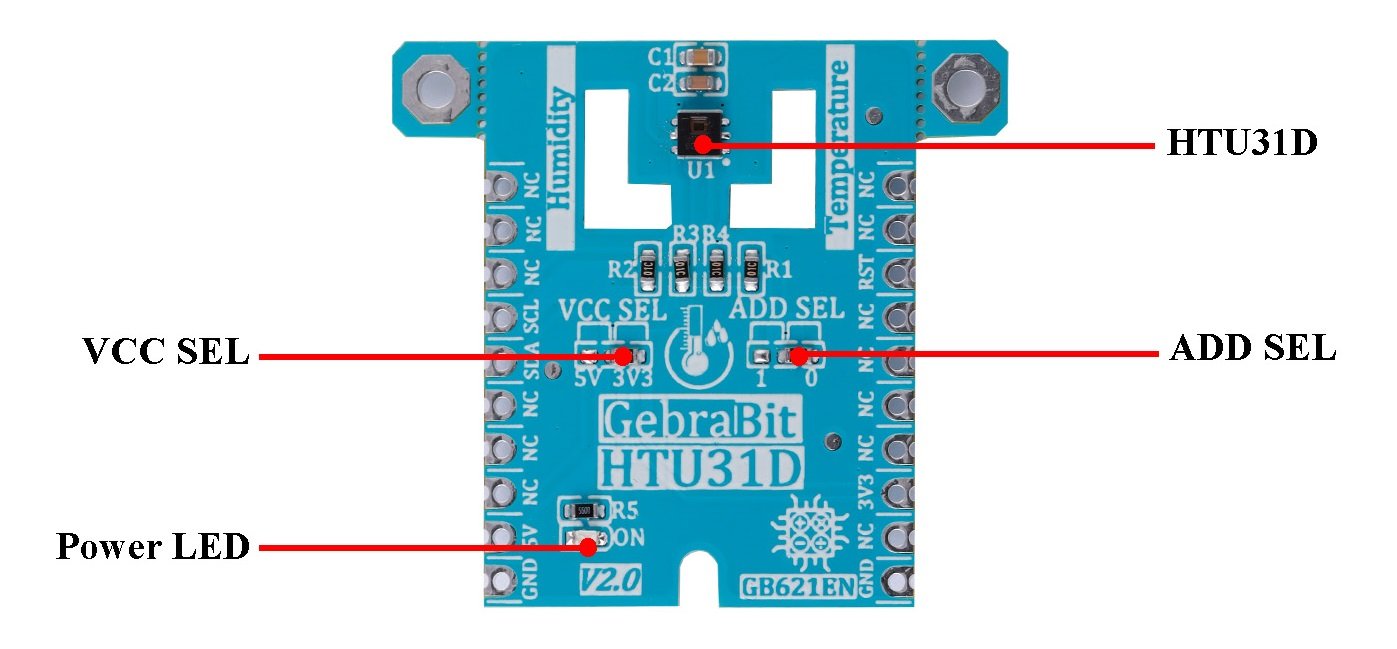 GebraBit HTU31D یک ماژول دیجیتالی اندازهگیری دما و رطوبت نسبی است. GebraBit HTU31D با ولتاژهای تغذیه 3V3 و 5V کار میکند که کاربران میتوانند به راحتی از طریق جامپر سلکتور روی ماژول، ولتاژ مورد نظر خود را انتخاب کنند. کاربران میتوانند از طریق پروتکل I2C، با GebraBit HTU31D ارتباط برقرار کرده و قادر به تنظیم آدرس I2C از طریق جامپر سلکتور ماژول، میباشند.